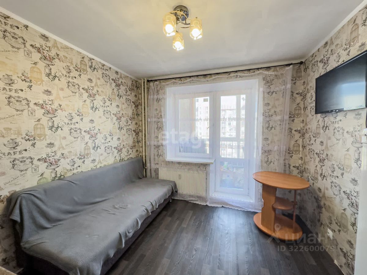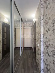 При входе в квартиру просторная прихожая с отлично размещенным шкафом-купе, комната с яркими обоями и светло-темным кухонным гарнитуром, диван на два спальных места.