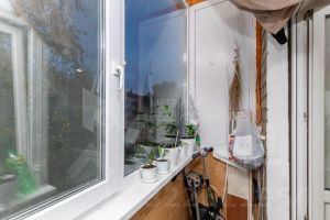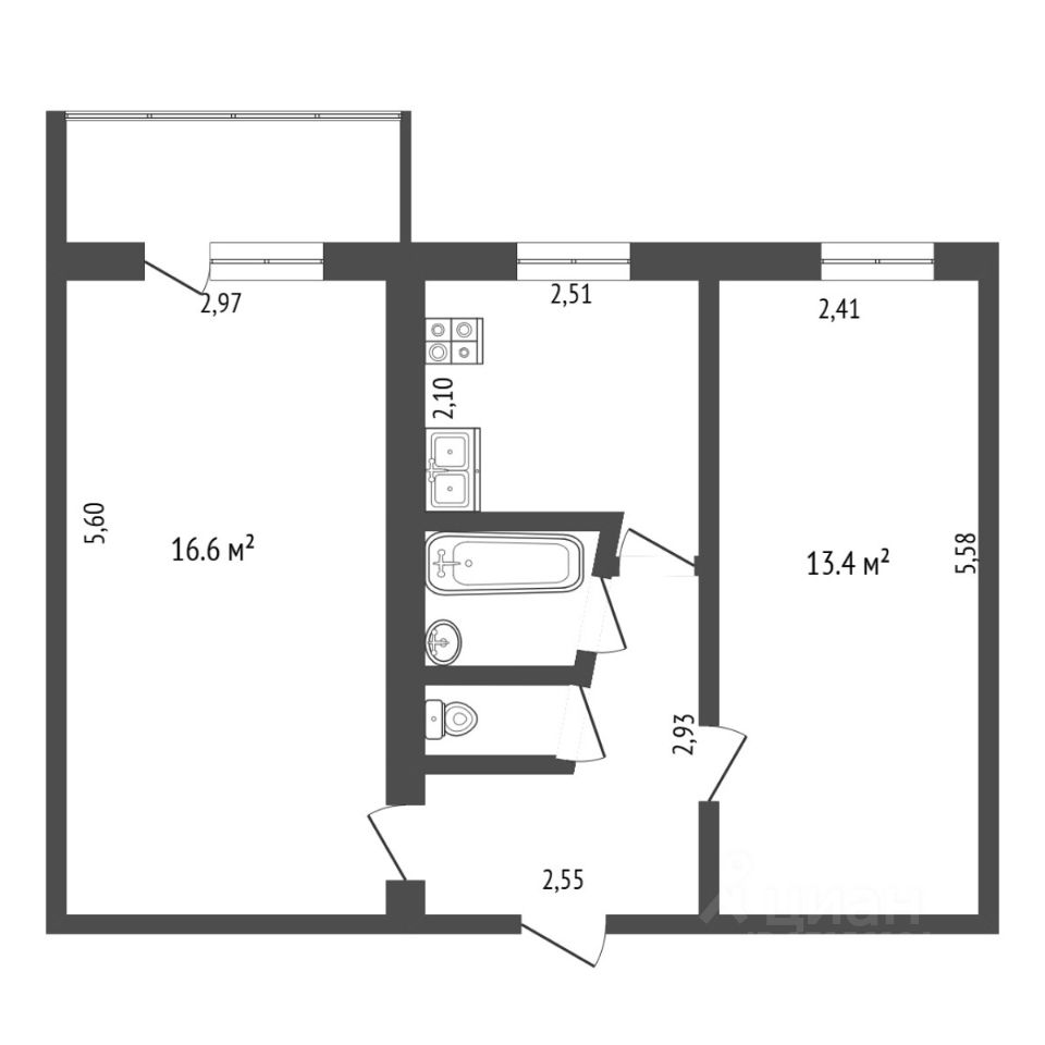 2 комнатная квартира 43,5 кв.м, 2 изолированные комнаты (16,6 кв.м; 13,4 кв.м), кухня 5,7 кв.м, совмещенный санузел, балкон (2,7 кв.м), коридор 4,7 кв.м. Высота потолков 2,57 м. Окна выходят во двор.
