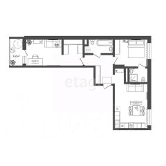 Кухня-гостиная 18м и 2е комнаты,,одна из них мастер-спальня.Квартира по планировке_распашонка, то есть комнаты находятся по обе стороны коридора напротив друг друга .Окна выходят на две стороны,во двор( удобно наблюдать за детьми с балкона на 3м этаже) и на соседние ЖК. Большая наземная парковка!