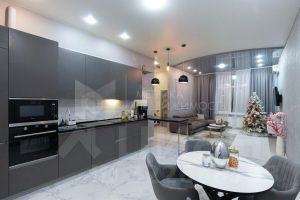 Заходя в дом вы попадаете в прихожую со встроенным шкафом-купе. Так же на первом этаже расположена кухня-гостиная с водяным тёплым полом, котельная с выходом на террасу, гостевой санузел и кладовая под лестницей. Кухонный гарнитур оснащён всей необходимой встроенной техникой. На первом этаже есть доступ в подвал на цокольном этаже, в котором можно обустроить, например спортзал или мастерскую.