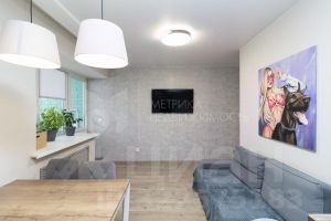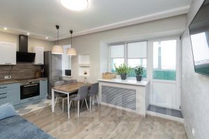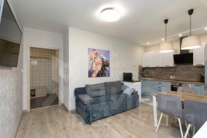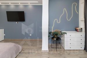 Ремонт выполнен в светлых тонах: в коридоре на полу керамогранит с подогревом, а также в ванной и в зоне кухонного гарнитура. На кухне и в комнате на полу ламинат, на стенах качественные обои, потолки натяжные высотой 2,7м, лоджия застеклена. Установлен кондиционер и бойлер.