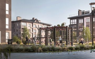 Дворы — закрыты от машин. Внутри: нейродинамические детские площадки, шезлонги для отдыха и перголы с гирляндами.