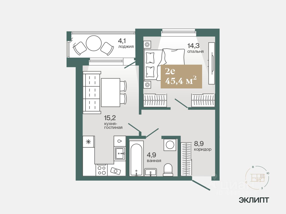 Планировка с просторной спальней — можете разместить здесь рабочую зону или поставить дополнительный шкаф. Кухня-гостиная с выходом на витражную лоджию. Место для готовки в отдельной нише.