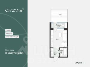 Студия с лоджией. Она с панорамным остеклением в пол. Там же выход в урбан-сад: летом можете поставить снаружи садовую мебель и выходить в урбан-сад, чтобы почитать книгу. Зимой — выпить горячий шоколад в пледе на свежем воздухе. Кухню можете разместить в нише и отгородить спальное место перегородками.
