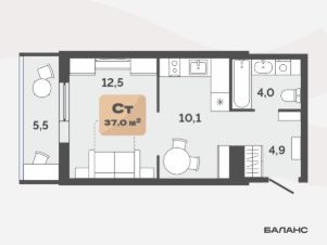 Просторная студия с перегородками, которые разделяют пространство квартиры на две комнаты. В одной из них выход на лоджию с панорамным остеклением— будет больше света. В другой комнате кухня. Вещи можете хранить в холле: здесь есть место для шкафа, комода и обувницы.