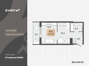 Просторная студия с перегородками, которые разделяют пространство квартиры на две комнаты. В одной из них выход на лоджию с панорамным остеклением— будет больше света. В другой комнате кухня. Вещи можете хранить в холле: здесь есть место для шкафа, комода и обувницы.