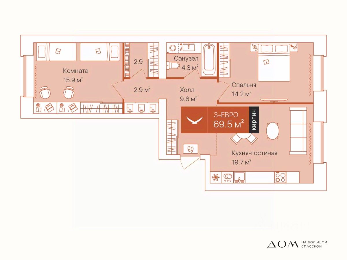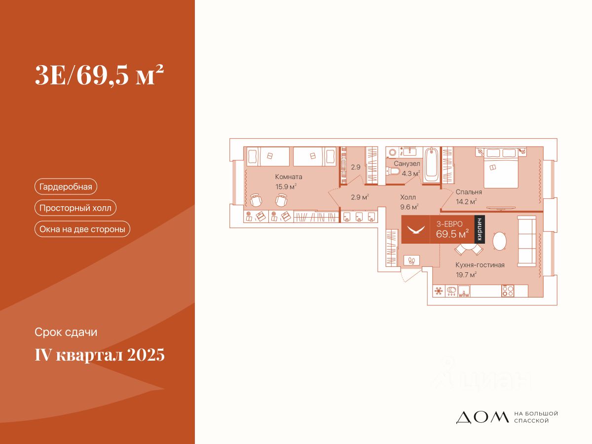 Квартира с гардеробной. Окна выходят на две стороны, в одной из комнат увеличенная рама. Кухня-гостиная почти 20 м² — хватит места для комфортного обустройства кухни и зоны отдыха.