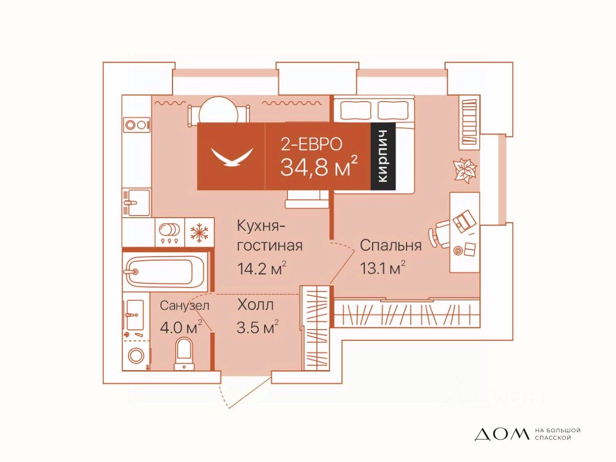 Квартира с просторной кухней-гостиной: есть место для готовки и отдыха. В спальне и холле ниши под хранение. Окна выходят на две стороны