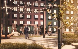 Двор без машин. Для автомобилей сейчас есть гостевая парковка рядом и строится многоуровневый паркинг. Для отдыха во дворе сделали амфитеатр, поставили перголы с гирляндами и подготовили многоуровневое озеленение. Для маленьких жителей готова детская площадка из натуральных материалов. Чтобы было безопасно, по периметру домов работает видеонаблюдение.