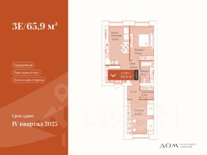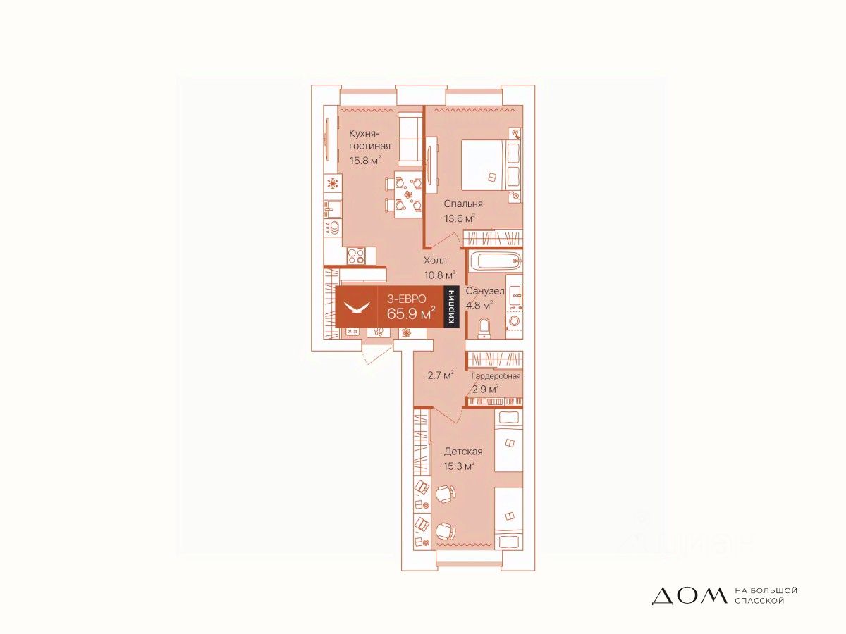 Квартира с окнами на две стороны. В планировке спальня и детская разнесены по разным частям квартиры: между ними санузел, гардеробная и ниша для шкафа-купе. В кухне-гостиной место для отдыха и столовой зоны.