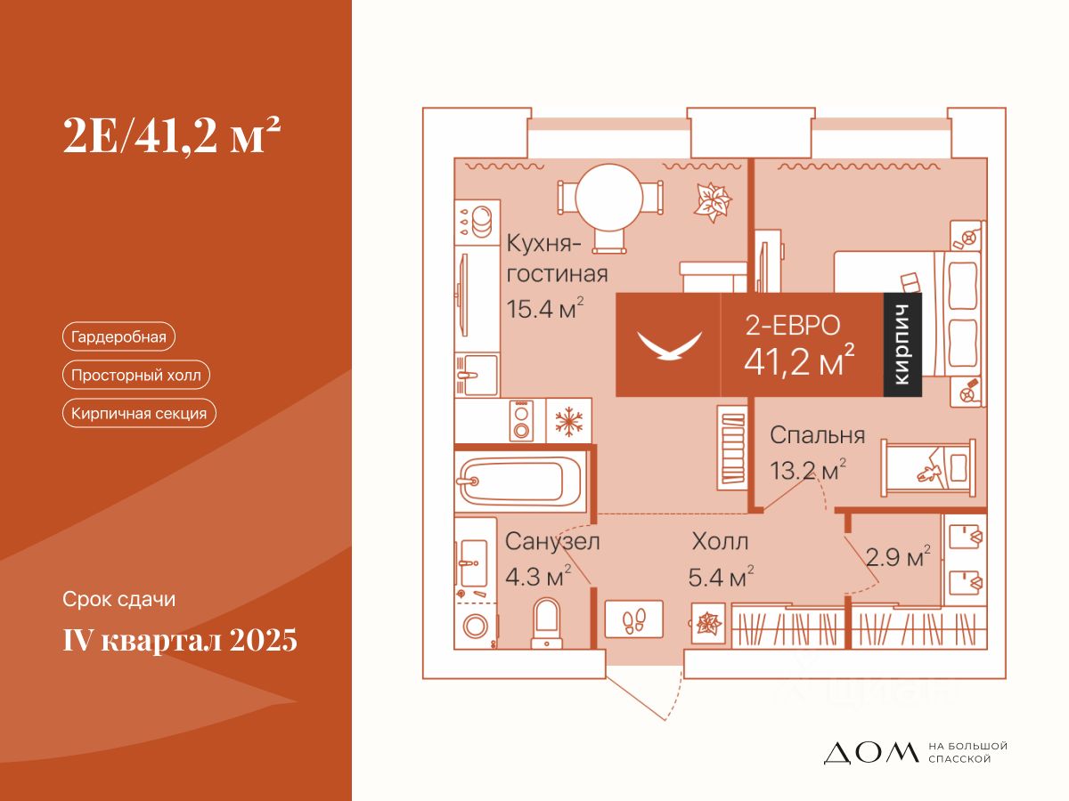 Евродвухкомнатная с просторными комнатами. Возле спальни гардеробная. В кухне-гостиной увеличенное окно.