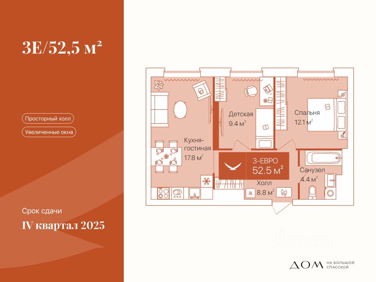 Планировка с двумя отдельным спальнями. Кухня-гостиная и спальня с увеличенными окнами. В холле просторно — есть ниша под шкаф.