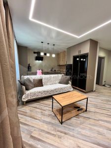 -По всей квартире установлен натяжной потолок с точечными светильниками, что придаёт интерьеру элегантный и современный вид, а также создаёт мягкое, равномерное освещение.
