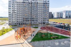 Жилой комплекс оснащён собственной газовой котельной, что гарантирует стабильное горячее водоснабжение без перебоев. В подъезде установлены три лифта, включая грузовой, что упрощает перемещение и доставку крупногабаритных предметов. Дополнительное удобство обеспечивают просторные колясочные. Территория комплекса благоустроена и полностью закрыта для автомобилей, что делает двор безопасным для детей. Здесь оборудованы современные детские площадки, воркаут-зона для занятий спортом и протяжённая аллея для прогулок.