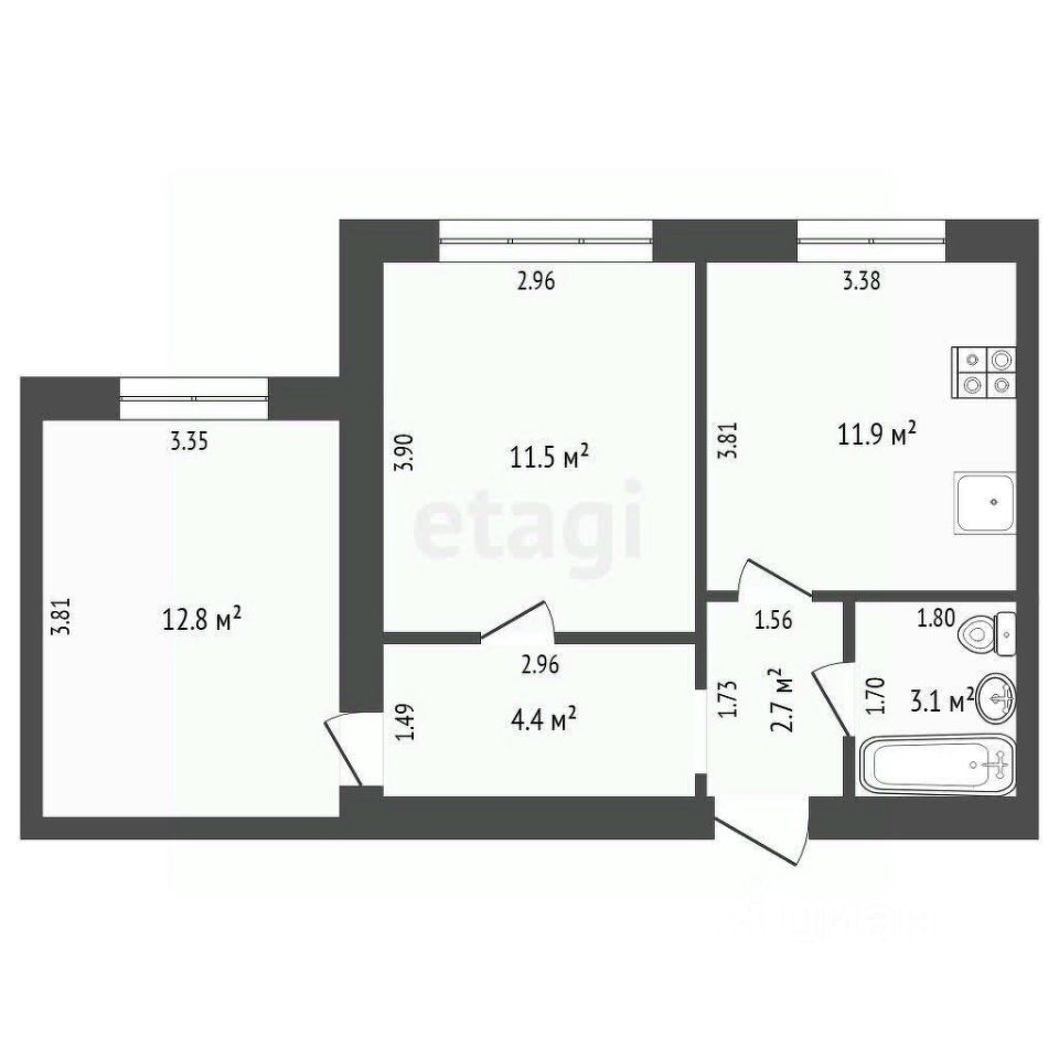 Комнаты изолированные, просторная квадратной формы кухня около 12м2, с/у совмещен в кафеле.