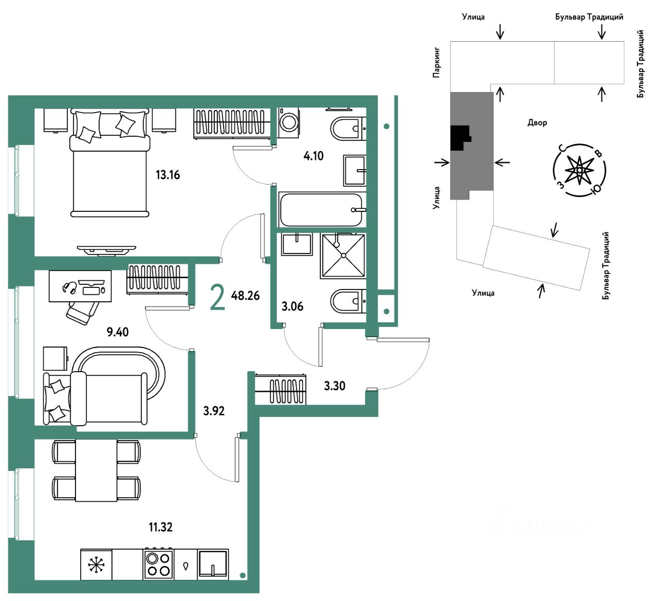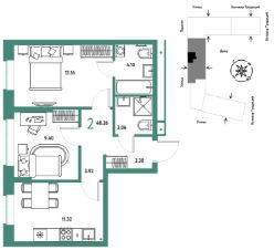 Продается 2комнатная квартира на 4 этаже от застройщика Страна Девелопмент. Площадь квартиры 48,26 кв. м.