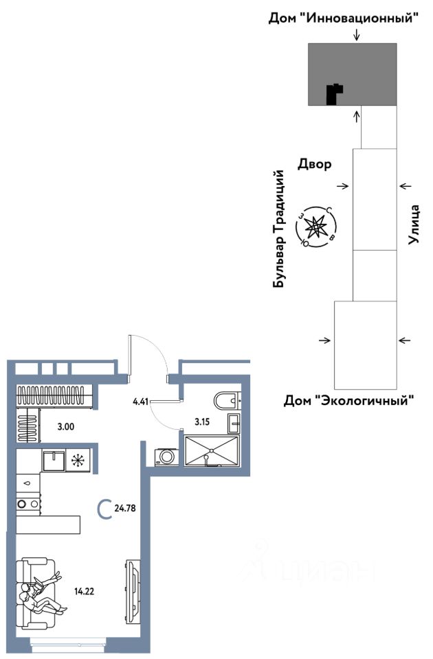 Продается 1комнатная квартира на 15 этаже от застройщика Страна Девелопмент. Площадь квартиры 24,78 кв. м.