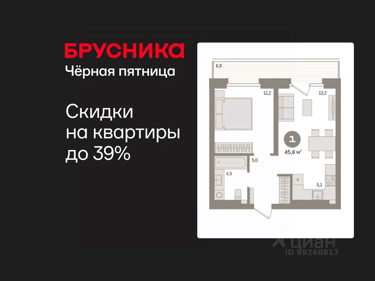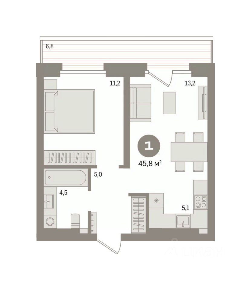 Квартира с кухней-гостиной и одной спальней в жилом районе "Речной порт". Особенности планировки: окна в пол, вид во двор, предчистовая отделка, балкон.
