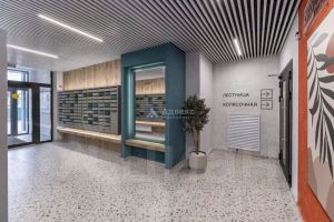 Лобби комплекса оформлено в современном стиле, где мягкие диваны создают комфортную атмосферу для ожидания такси или встречи с курьером. Яркие картины молодых художников на стенах придают помещению уникальность и уют, словно вы находитесь в дорогом отеле.