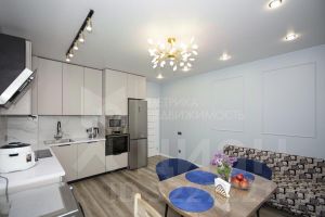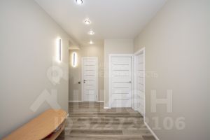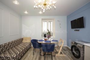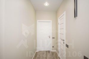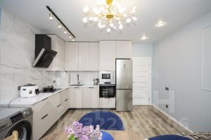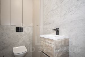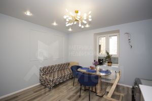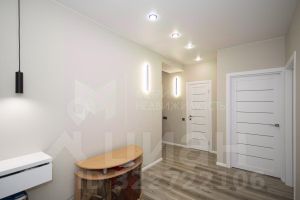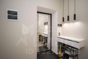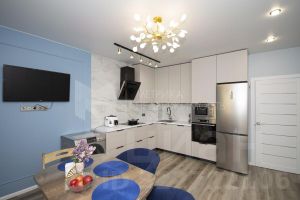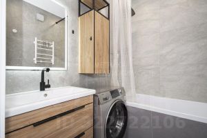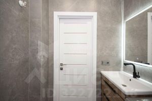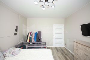 При ремонте выровнены все стены, поменяли всю электропроводку Застройщика, она проложена по потолку. На полу кварцвинил единым контуром, стены покраска, в санузлах керамогранит с углом под 45 градусов, потолки натяжные матовые. Поменяна входная дверь (сейчас с зеркалом).