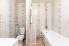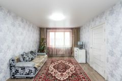 Квартира готова к проживанию: выполнен косметический ремонт. На полу — линолеум, стены - обои, натяжной потолок в одной комнате. Просторный совмещенный санузел обшит пластиковыми панелями, пол кафель, установлены ванна и унитаз. При продаже остается кухонный гарнитур.
