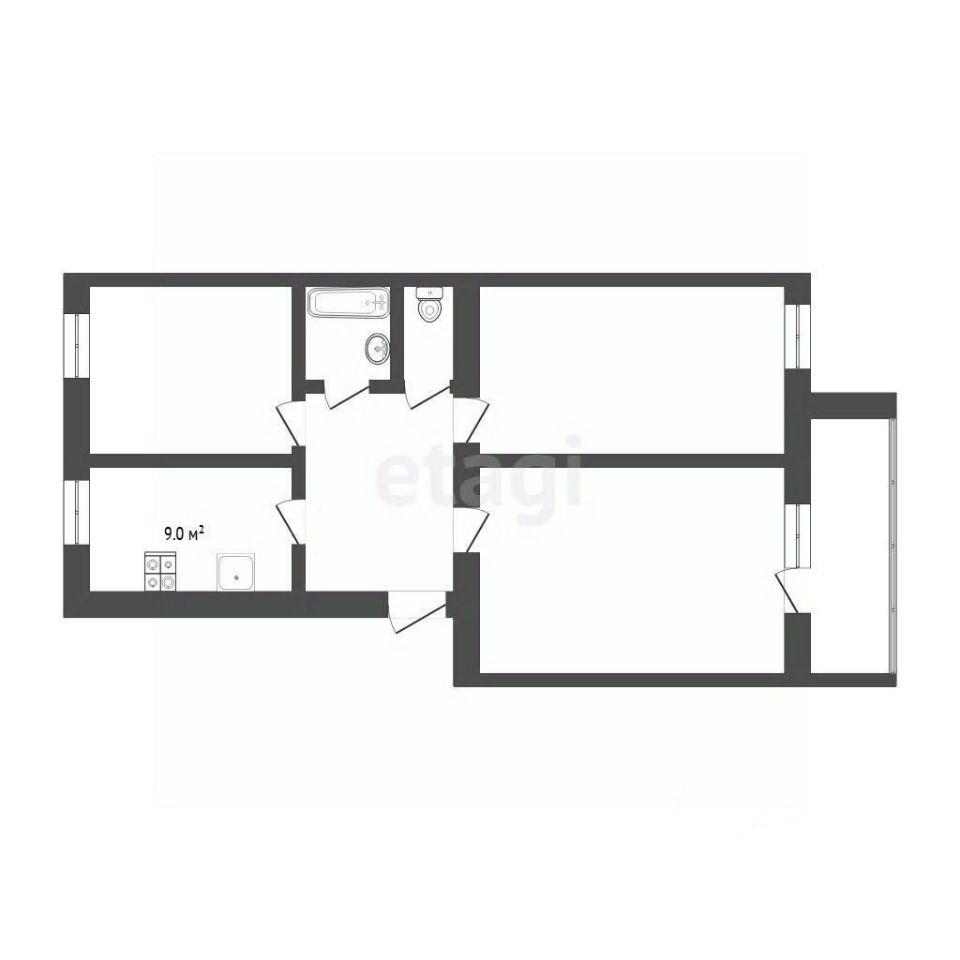Планировка квартиры функциональна - по одну сторону расположены зал и комната, по другую вторая комната и кухня.