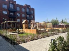 Во дворе расположены детская игровая площадка и лаунж-зона с патио из натуральных материалов.