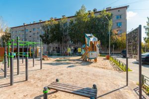 Во дворе недавно провели ремонт: установили новую детскую площадку и озеленили территорию. Создана комфортная и безопасная среда для жильцов.