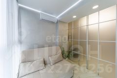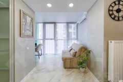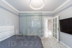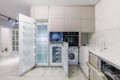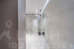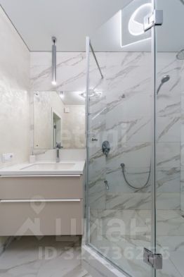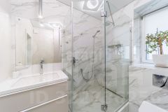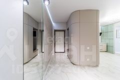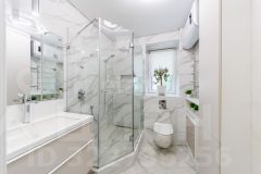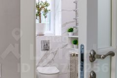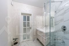 Сан. узел в дорогом кафеле соответствует общему дизайну квартиры. Большинство мебели для сохранения целостности и функциональности пространства сделана по индивидуальному заказу и идеально вписывается в размеры квартиры.