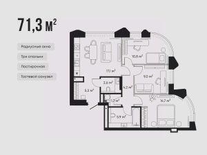 Планировка предусматривает три спальни, кухню-гостиную, дополнительный санузел и постирочную.