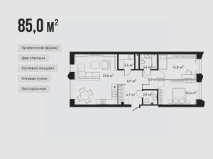 Экспозиционная планировка строго разделяет личное и общее пространство в квартире. Она предусматривает две спальни с выходом на балкон, просторную кухню-гостиную, дополнительный санузел и постирочную.