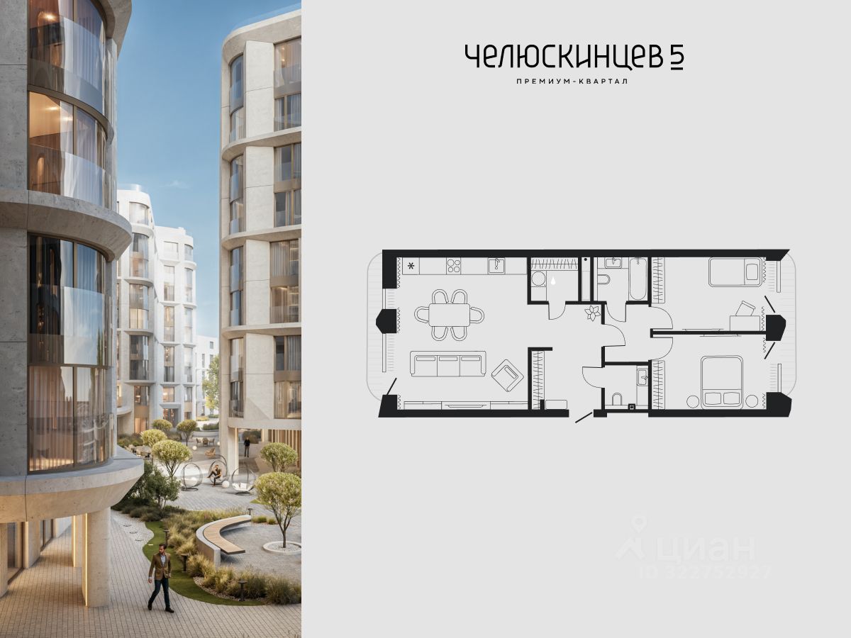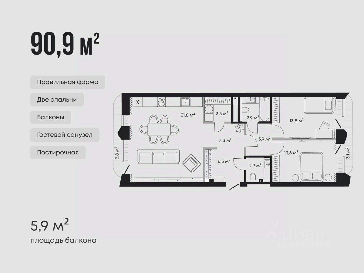 Экспозиционная планировка строго разделяет личное и общее пространство в квартире. Она предусматривает две спальни с выходом на балкон, просторную кухню-гостиную, дополнительный санузел и постирочную.