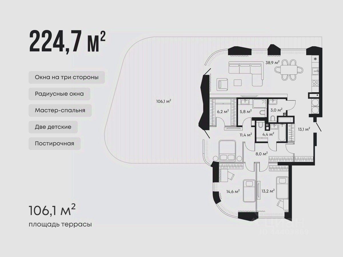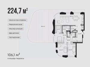Планировка предусматривает мастер-спальню, две детские комнаты, просторную кухню-гостиную, дополнительный санузел и постирочную.