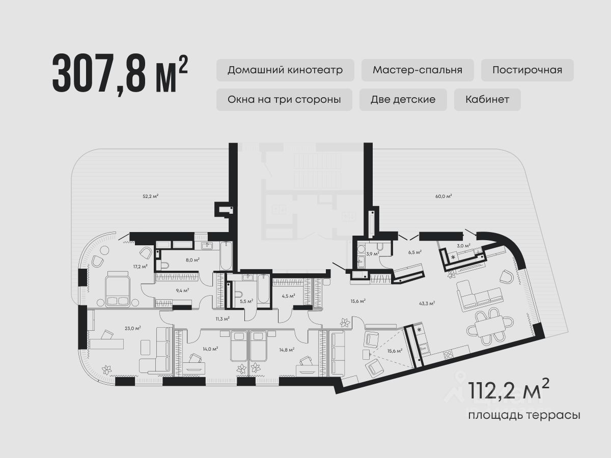 С террасы площадью 112,2 м² на последнем этаже открывается наилучший вид на весь центр, реку и Мост Влюблённых. Здесь можно организовать летнюю кухню, игровую или фитнес-зону.
