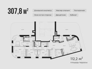 Планировка занимает весь этаж и предусматривает мастер-спальню с окном в ванной, две детские комнаты, кабинет, домашний кинотеатр, большую кухню-гостиную, дополнительный санузел и постирочную.