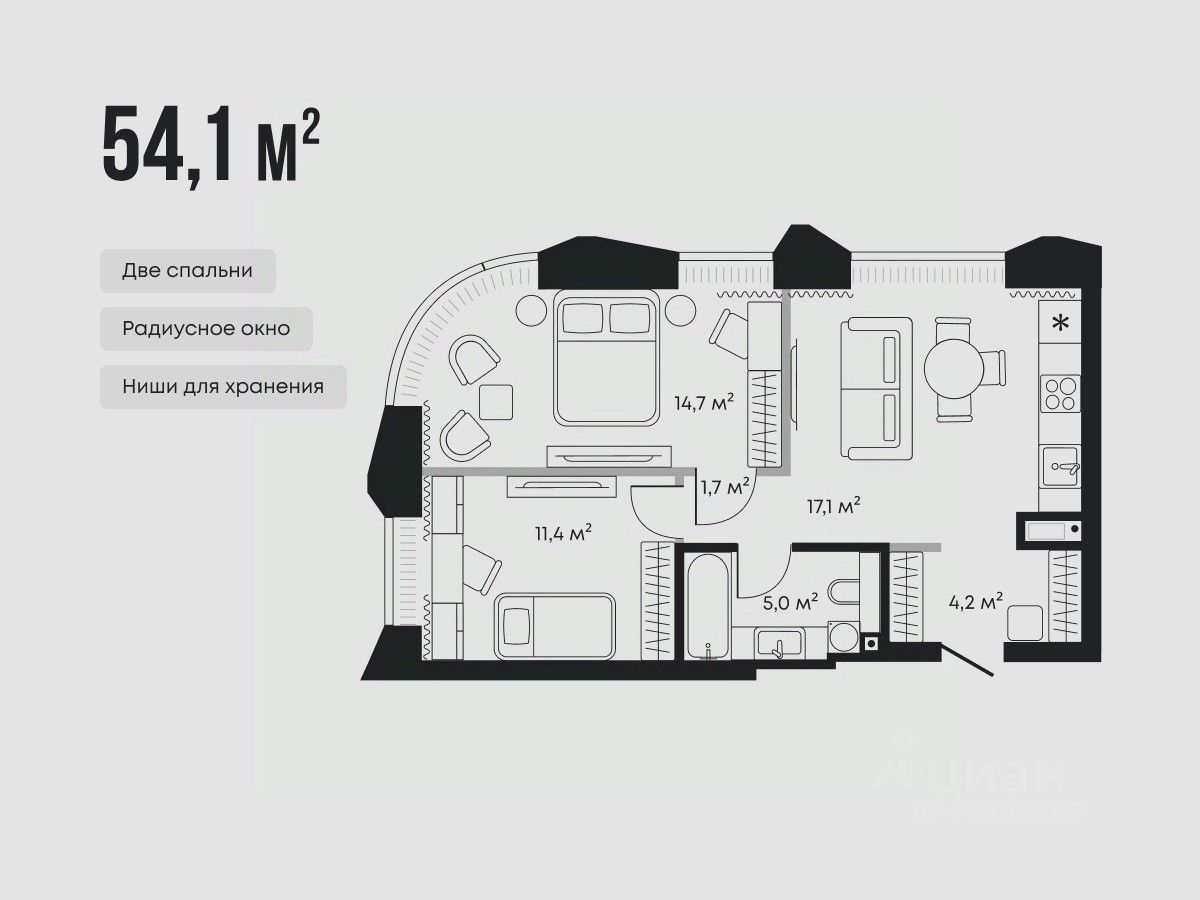 Планировка предусматривает спальню с увеличенной площадью остекления, детскую и кухню-гостиную.