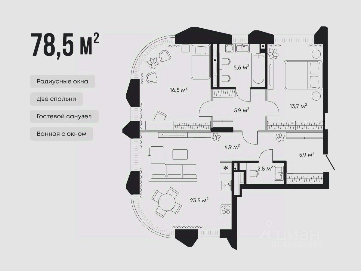 Высота окон в квартире — 2,4 метра, поэтому в комнаты проникает много естественного света. В спальне и кухне-гостиной спроектированы радиусные окна для бесшовного обзора на две стороны.
