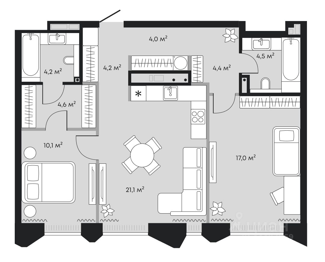 Квартира с приватными спальнями в квартале премиум-класса. Рядом пешеходный бульвар, набережная, топовые школы и лучшая гастрономия в городе.