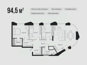 Планировка предусматривает мастер-спальню, две детские комнаты и просторную кухню-гостиную.
