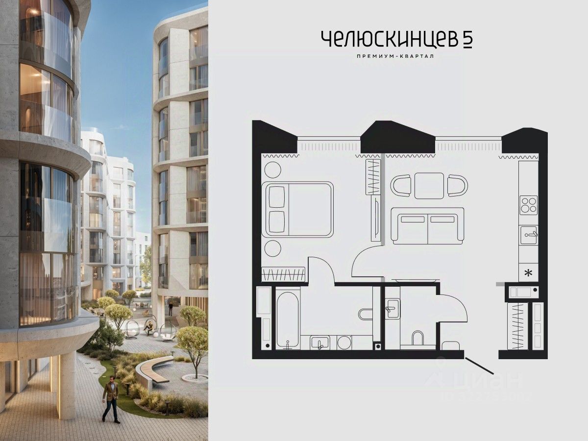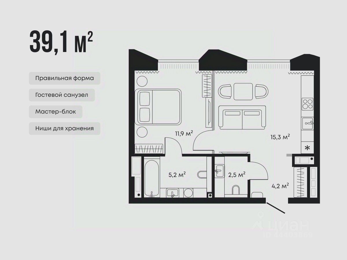 Планировка предусматривает спальню с отдельной ванной, кухню-гостиную и дополнительный санузел.