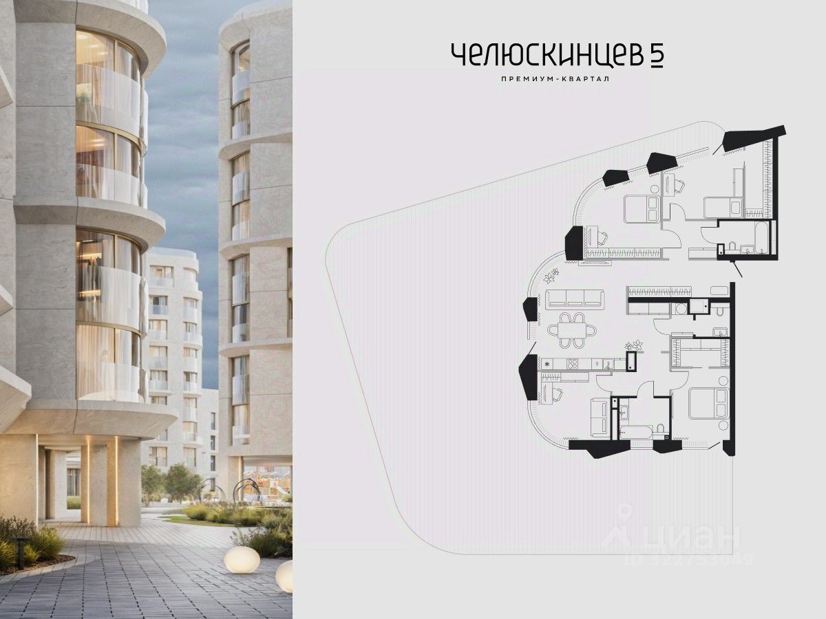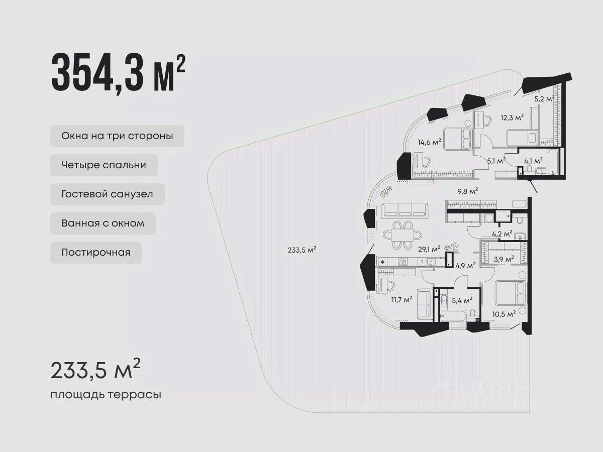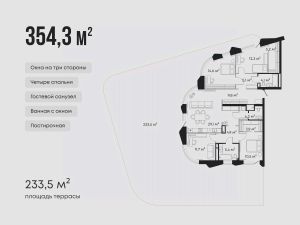 Планировка предусматривает четыре спальни с гардеробными и ванными комнатами, кухню-гостиную и постирочную.