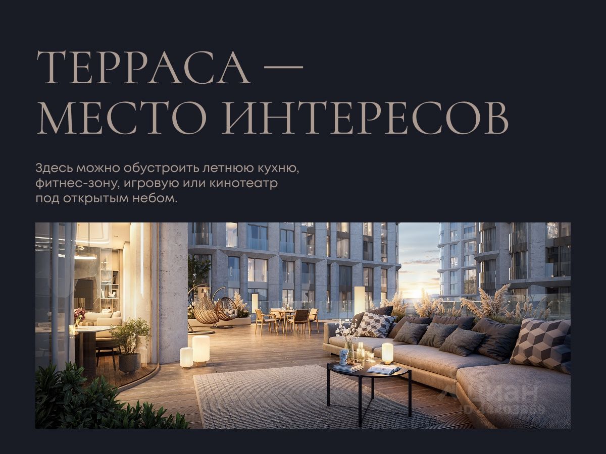 Терраса площадью 233,6 м² на уровне второго этажа позволяет пользоваться всеми преимуществами открытого пространства, но без ощущения высоты. Здесь можно организовать летнюю кухню, камерный кинотеатр с игровой или фитнес-зону. Выходов на террасу три: из спален и кухни-гостиной.