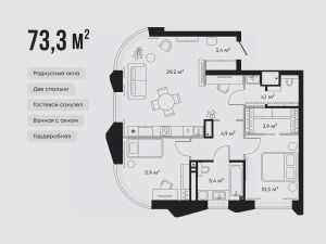 Планировка предусматривает спальню с гардеробной, детскую, просторную кухню-гостиную, ванную с окном и постирочную.