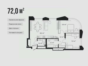 Экспозиционная планировка строго разделяет личное и общее пространство в квартире. Она предусматривает две спальни, просторную кухню-гостиную и дополнительный санузел.