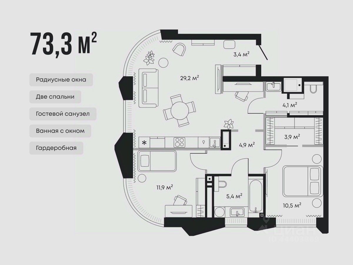 Планировка предусматривает спальню с гардеробной, детскую, просторную кухню-гостиную, ванную с окном и постирочную.