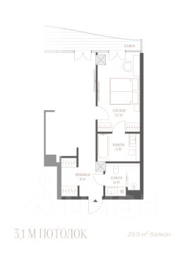 Окна выходят на непрерывный балкон площадью до 29,9 м². Выходов на балкон три.