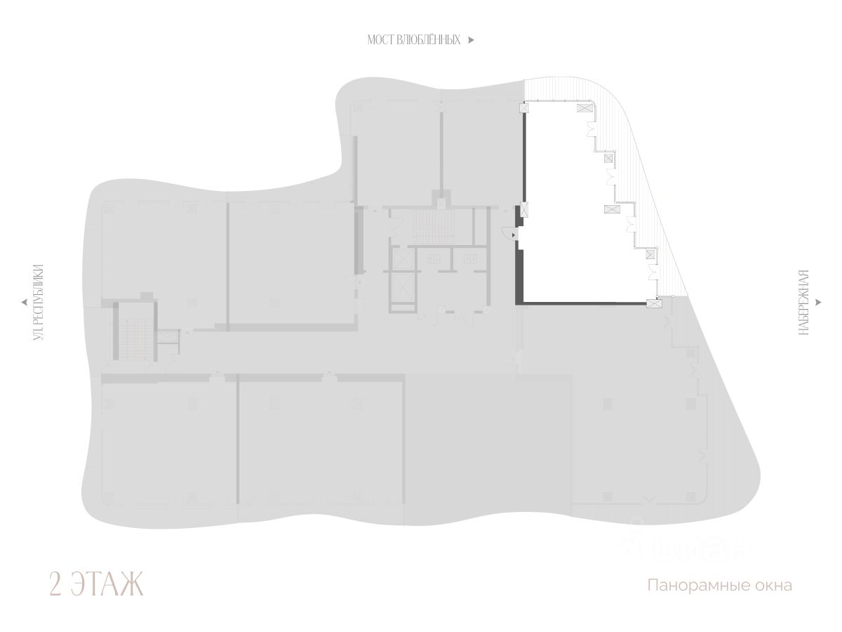 Окна выходят на непрерывный балкон площадью до 49,3 м². Выходов на балкон четыре.