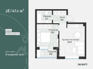 Планировка с лоджией. Выход на неё через спальню. Гостиная объеденена с кухней, при этом у каждого пространства своё место.