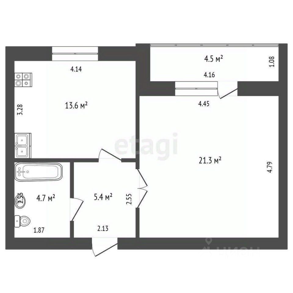 Планировка функциональная: просторная светлая комната квадратной формы 21.3 кв.м., с выходом на большую застекленную лоджию 4.5 кв.м., комфортного размера прихожая 5.4 кв.м., шикарная просторная кухня 13.6 кв.м., совмещенный санузел 4.7 кв.м.