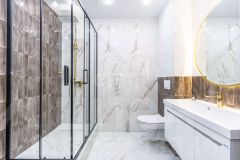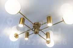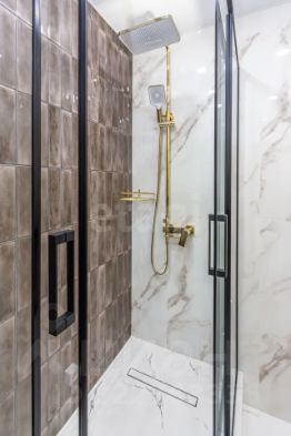 Ремонт выполнен в тёплых бежевых и белых тонах, с использованием элементов декора - золотых оттенков : люстры, смесители, фарнитура.